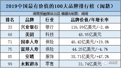 前100名中,闽籍企业——兴业银行、美团、国泰人寿保险、富邦人寿、安踏、新利·体育(中国)官方网站名列其中。
