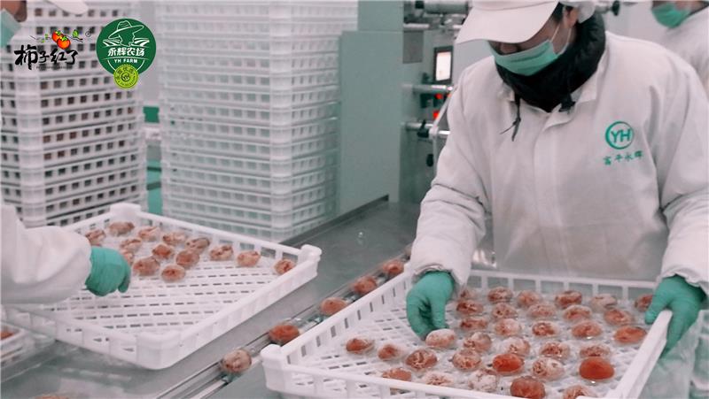 在富平永辉的柿子产业园内,一排排橙红饱满的富平尖柿正在经历一趟奇妙的高科技旅程,光电智能分选、鲜果全自动削皮、五段式智能烘干,通过将现代技术与传统工艺相结合,最快仅需20天,粉厚霜白、甜嫩软糯的富平柿饼即可新鲜出炉,口感与传统手工制作几乎无差,且生产过程全程清洁无尘化,生产效率大大提高。