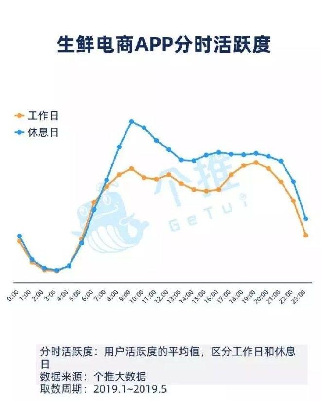 从生鲜电商APP的分时活跃度数据来看,工作日休息日的趋势有较大差别。工作日活跃时间比较平均,在早上9点、中午12点会有活跃小高峰,晚上7点为活跃峰值。休息日主要在早上9点活跃,且活跃度明显高于日常。