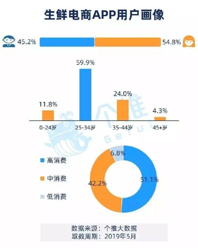 个推大数据近日推出《生鲜电商APP数据报告》(取数周期从2018面1额到2019年5月),有近5成手机用户已经下载了各类生鲜APP,年轻的中等收入女性是最活跃的用户。