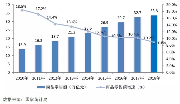 图/2010-2018年我国商品零售额及增速