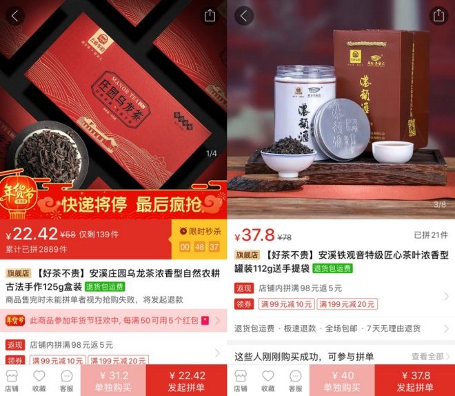 ▲云岭茶叶带来的庄园乌龙茶和大师铁观音,在拼多多年货节期间,两款产品还在原有价格基础上推出了限时优惠。
