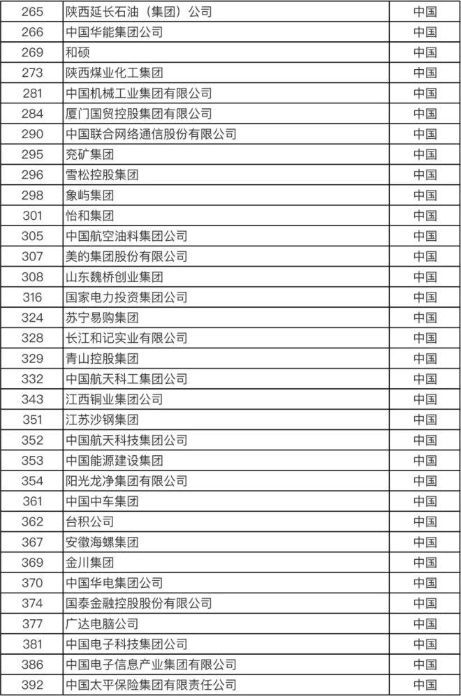 以下为2020年《财富》世界500强中国榜单: