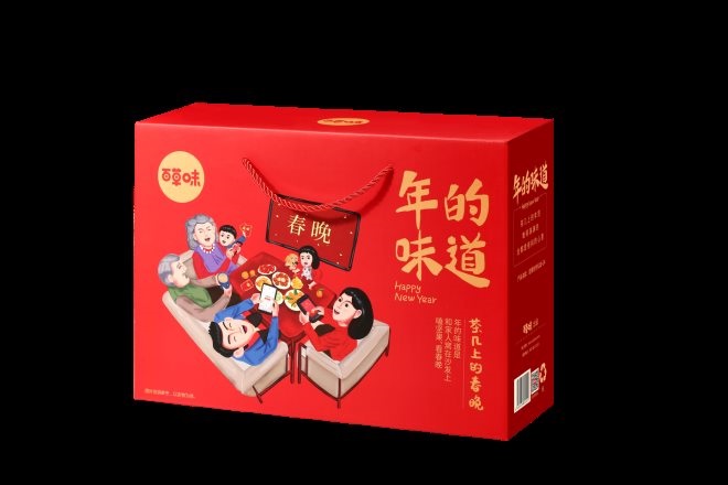(百草味“年的味道”系列之茶几上的春晚礼盒)
