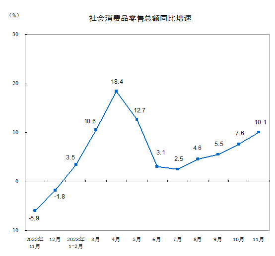 11月份,社会消费品零售总额42505亿元,同比增长10.1%。 ...