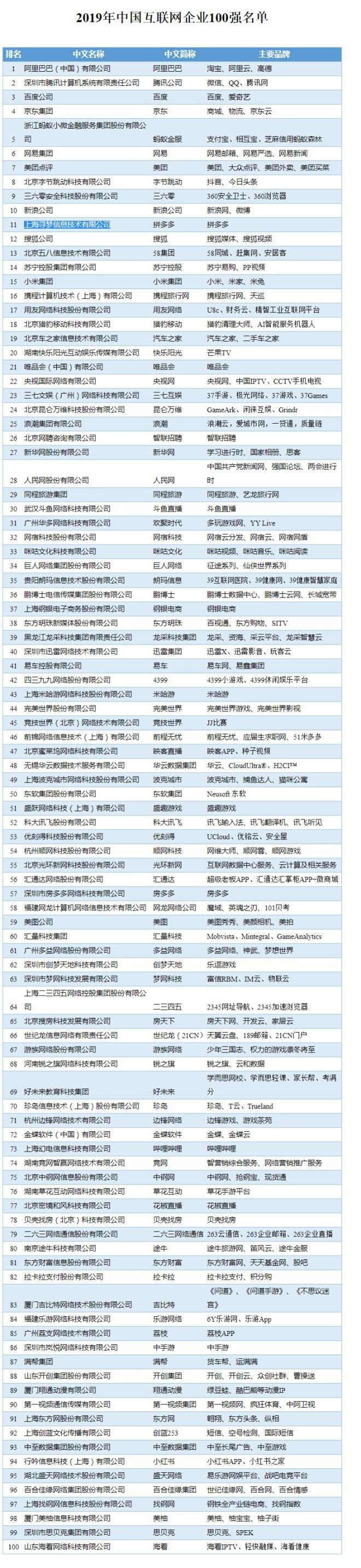 2019年中国互联网企业100强:阿里第一 京东第四