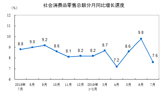 7月全国社会消费品零售总额同比增长7.6%