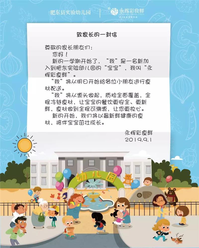 9月2日起,彩食鲜将作为肥东实验幼儿园的食材供应商,配送食堂每日所需的新鲜食材。以此为契机,彩食鲜公开了“致家长的一封信”,表达了彩食鲜严守食品安全的决心与信心。
