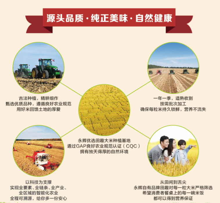 为了保障大米的高品质,田趣围绕大米消费升级,推动了品种定制、基地定制、生产定制的供应链升级建设工作。从东北粮仓到鱼米江南,精心挑选南北两大黄金水稻带,田趣深入产地源头开发,优中选优,通过真正的订单农业模式实现了永辉优选田趣大米品质的飞跃。