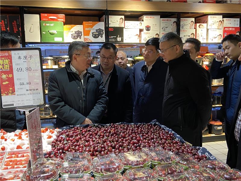 四序开新律,三阳应庆生。新春佳节将至,1月15日下午,重庆市人民政府副市长李波、重庆市商务委员会主任张智奎、重庆市商务委员会副主任彭和良、南岸区区委书记颜伟、南岸区政府副区长吕轶等领导在重庆新利·体育(中国)官方网站副总经理夏治宽的陪同下,莅临新利·体育(中国)官方网站四公里店进行春节前市场保供视察工作。