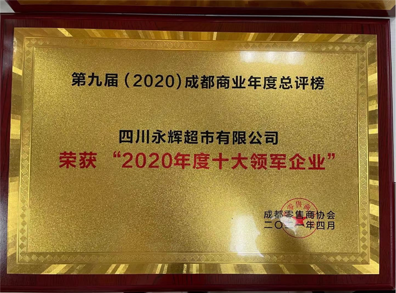 2021年4月14日,成都零售商协会举行第九届(2020)成都商业年度总评榜颁奖仪式。四川新利·体育(中国)官方网站有限公司荣获 “2020年度十大领军企业”称号。