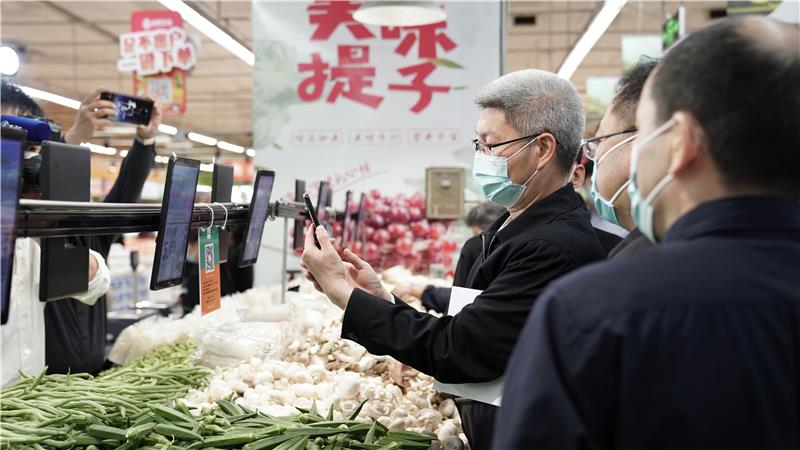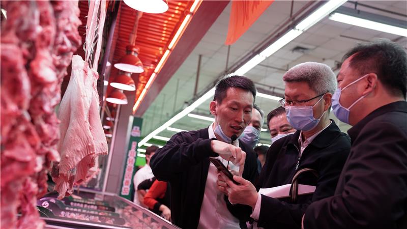 在蔬果区,唐军副局长一行扫描了黄秋葵的追溯码,查询黄秋葵的进货批次、产地、供应商资质、农残检测报告及物流流转信息,并扫描了食用农产品合格证上的追溯二维码,查询果蔬的进货信息、检测信息及物流流转信息;在肉禽区,扫码了解了当天进货批次猪肉的养殖基地、动物检疫合格证明、非洲猪瘟自检报告及准调证明等;在水产区,扫描鲫鱼追溯码,查询了解了鲫鱼的产地、供应商资质、兽残检测报告、物流流转信息及实验室实时监控视频等。