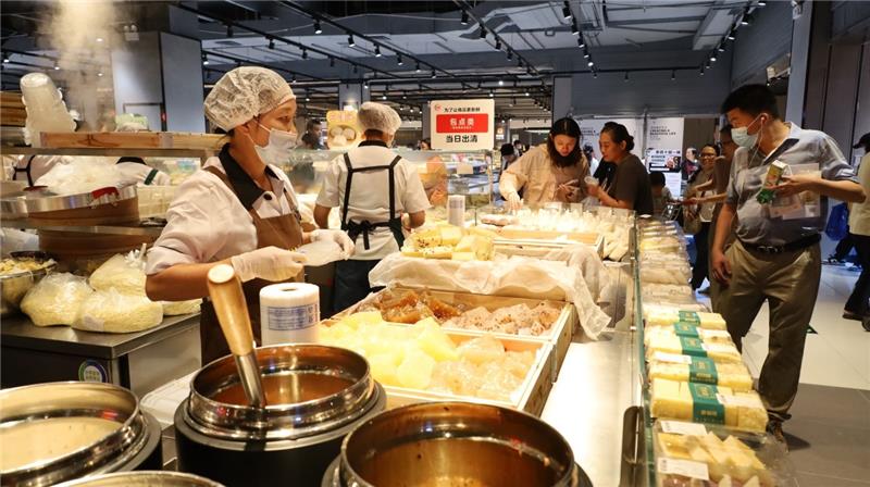 过去,不少顾客对永辉的印象更多聚焦在生鲜产品上,但现在,像奈雪的茶、张一元、瑞幸、美心、煌上煌、绝味这些热门的品牌都出现在了公园道店的货架上,选品更时尚,更多元。在‘老本行’生鲜方面,保留了部分顾客认可度高的商品,也增加了M5级别的安格斯牛肉、俄罗斯进口的帝王蟹等“新宠”。除了商品的调整,公园道店还有了更多“烟火气”。门店入口处增加了特色烘焙区,6名烘焙师现场制作,推出了黑芝麻贝果、红茶奶酥等烘焙产品。新增了“永辉食堂”,不仅能够为顾客现场加工部分生鲜产品,还提供捞化、钵钵鸡、轻食、卤味、麻辣烫、炸串、寿司等等餐饮选择。门店还试点了当下流行的“海鲜自助”模式,顾客可以自由挑选装盘的海鲜,丰俭由人。