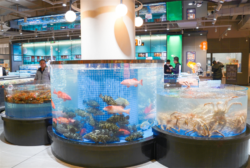 为匹配消费者的个性化需求,奥体店精心打造了整体场景,由胖东来天使城工程团队全程参与,发挥了极大的想象力,设计以浅灰色为主色调,搭配橙色标识装饰增添活力,动线通道自由、宽敞,点缀幽蓝色的观赏海鲜鱼缸,更添氛围感。