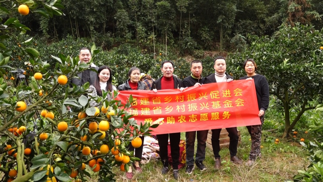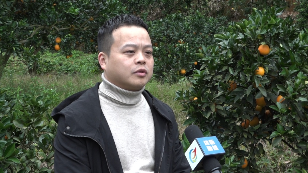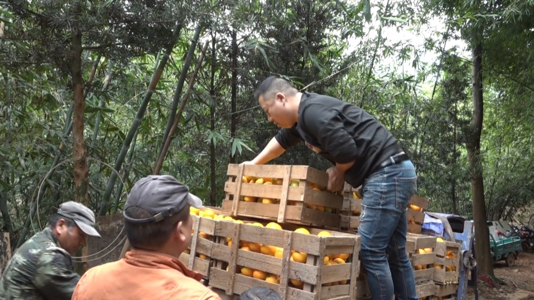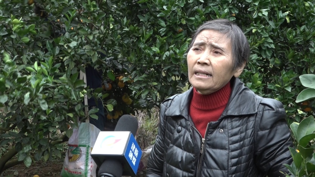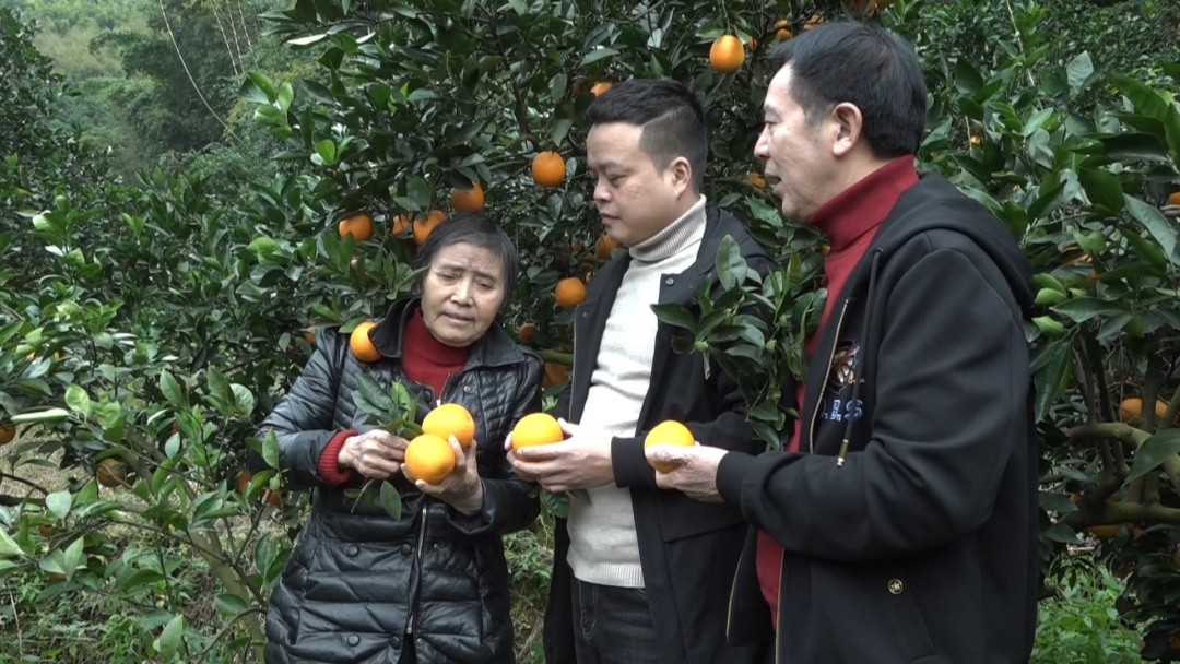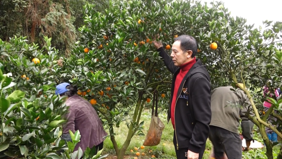 果园里橙香四溢,黄澄澄的脐橙挂满枝头,工人们娴熟的将脐橙摘下。果树下,帮助朱招弟与永辉牵线搭桥的爱心人士游厚寿也来看望朱招弟一家。